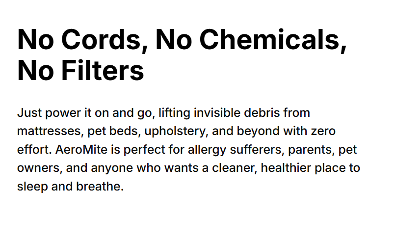 We know the importance of a true deep clean, which is why we created the AeroMite Vacuum. Get rid of unseen pollutants with the powerful AeroMite Vacuum cleaner. Don't forget to order your AeroMite Vacuum today! The superior design of the AeroMite Vacuum cleaner makes all the difference.