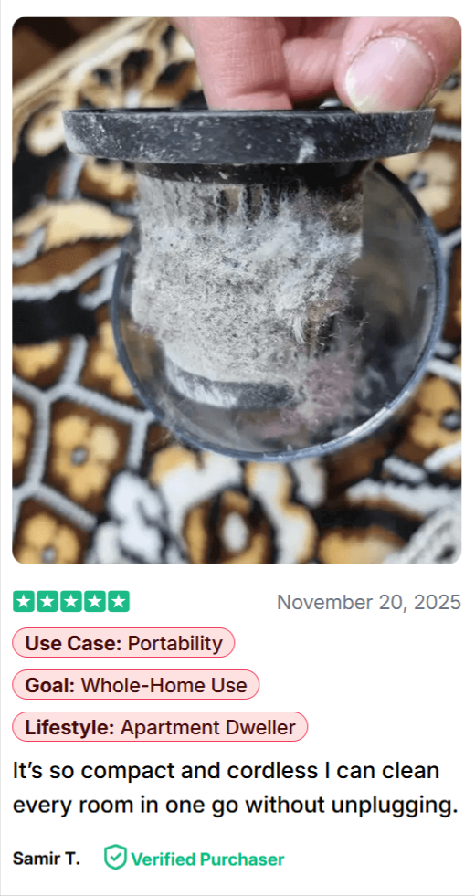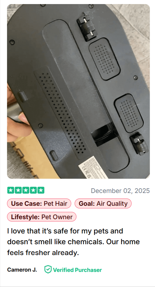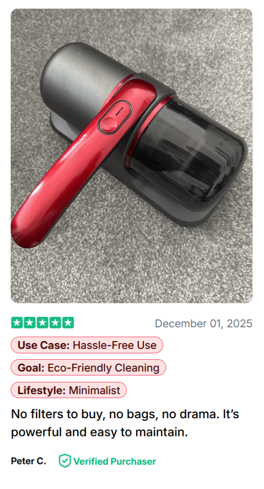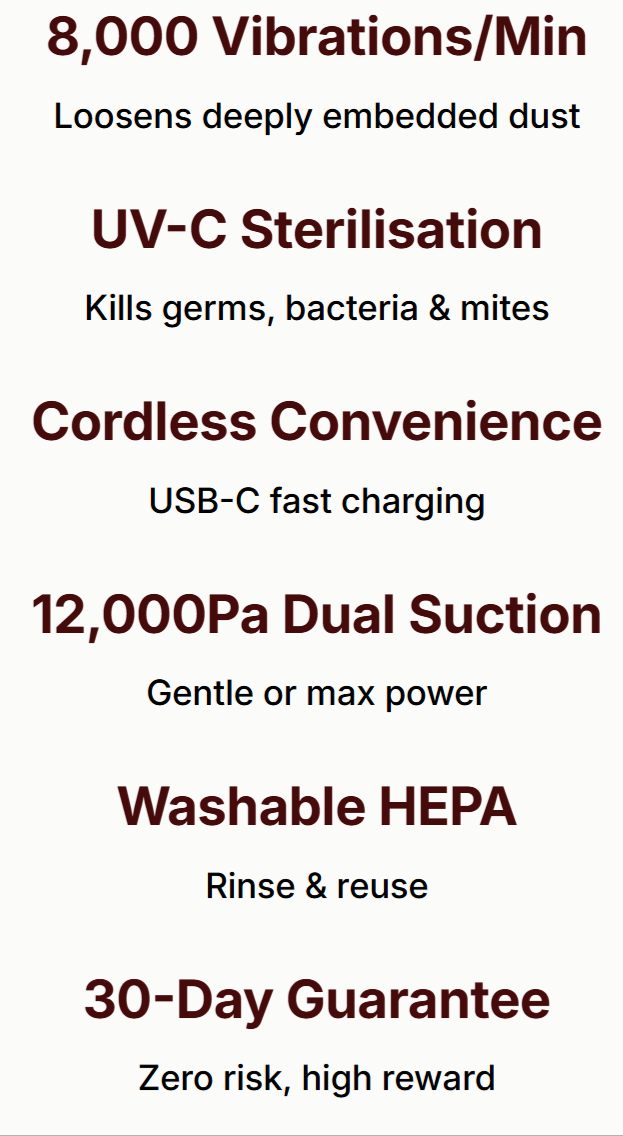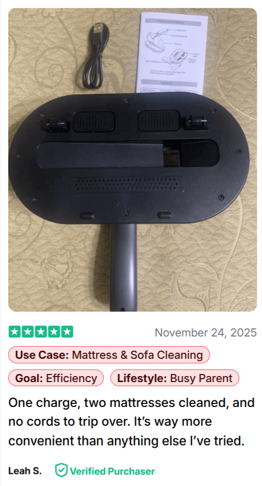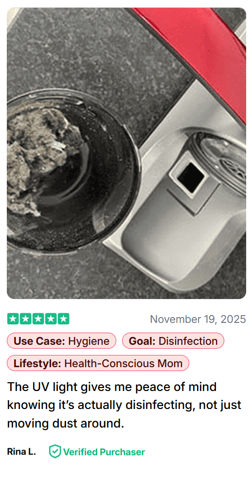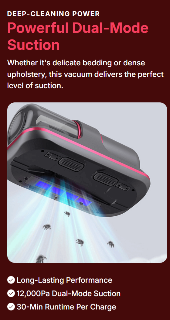 ✔ 12,000 Pa suction motor — pulls out mites, dander, mold spores, dead skin and micro-dust