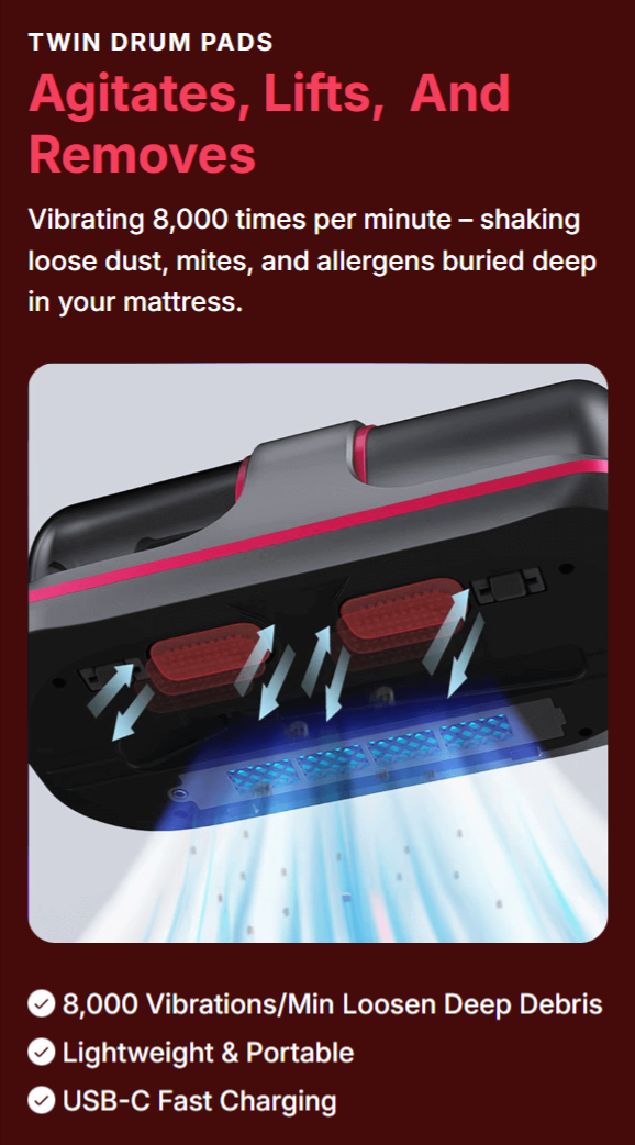 ✔ 8,000/min high-frequency vibration — breaks the bond between fabric fibers and deep-seated allergens